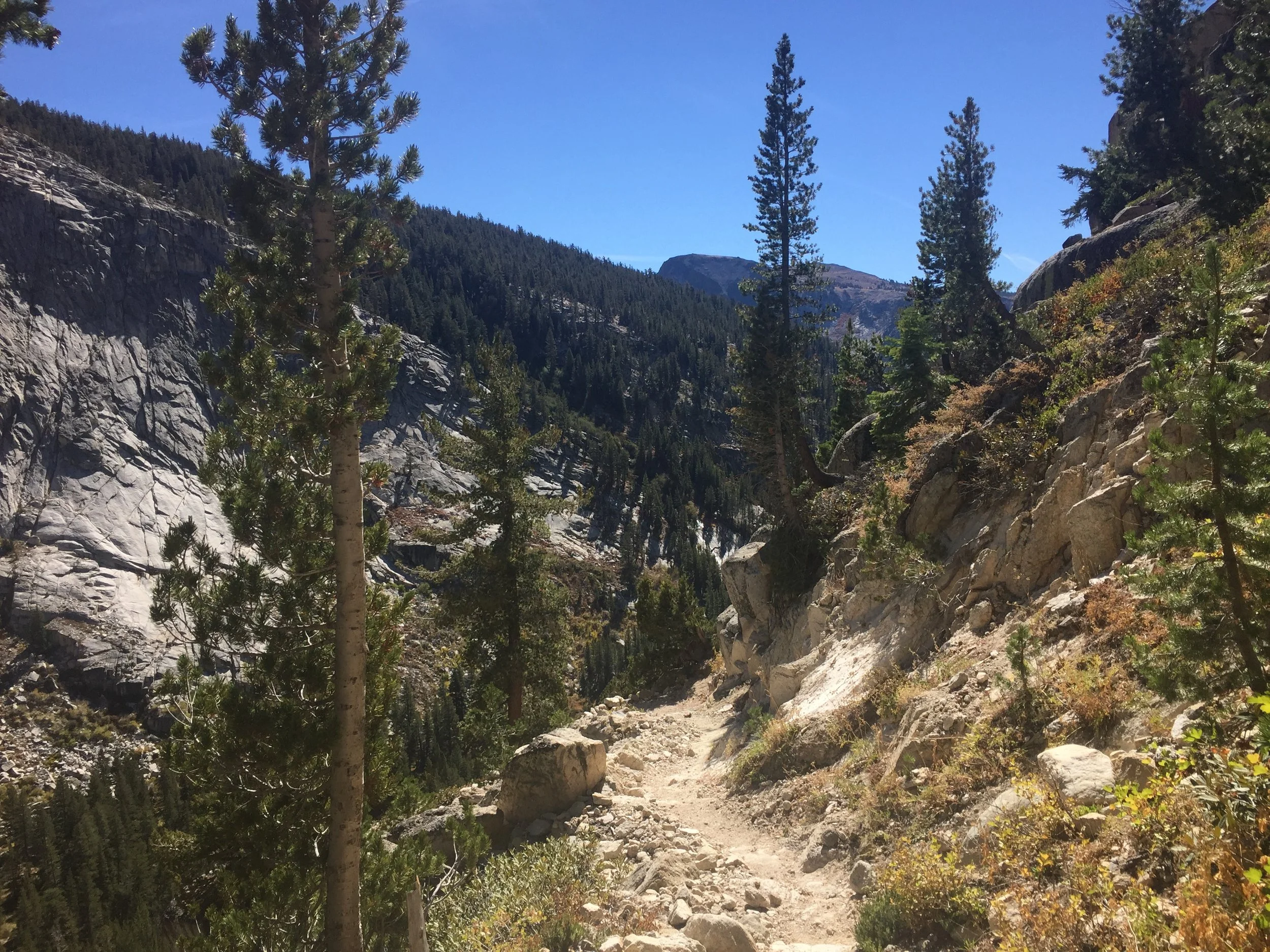 The descent is so beautiful, the colours, the lakes, the blue sky. I try and make up some time as I'm much quicker going downhill. It's not easy though as the trail gets pretty steep in some places and very rocky. But I keep pushing forwards. I think I see Catwater so I try to catch up and discover it's two JMTers (people hiking the John Muir Trail – the JMT and the PCT are the same trail for quite a while). They say they have seen Catwater and it was only about 5 minutes ago. So I make my way down the steep rocks to a creek where I fill up with water. I'm so thirsty today. And a good thing about the Sierra in October is that I haven't had to ford any creeks yet. The water is low so I can just hop across on rocks.