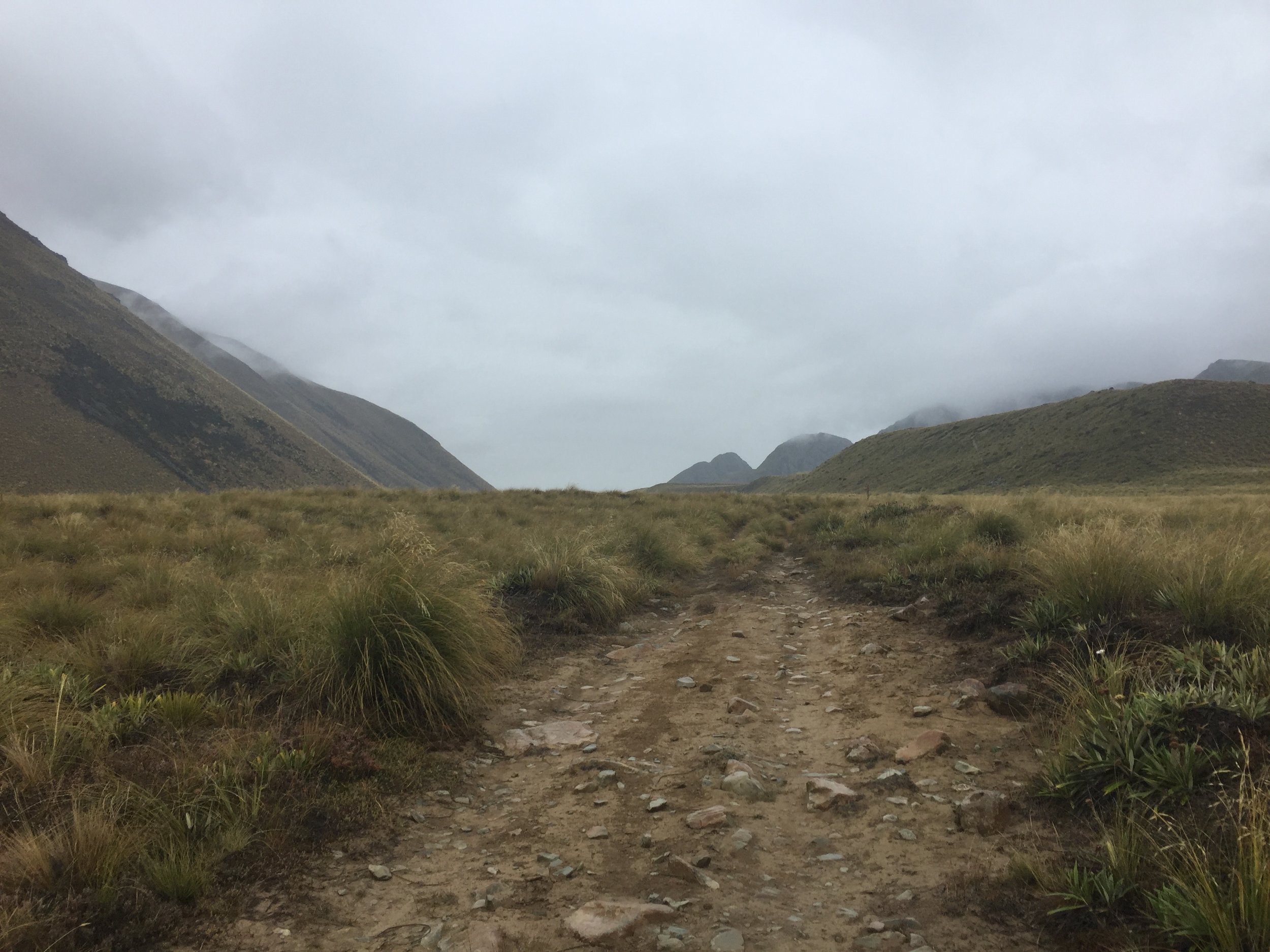 When I woke around 7:30am it was still raining and I didn't want to get out of my sleeping bag. So I wrote about the day which I didn't get the chance to do before I fell asleep and hoped the rain would stop. Which it eventually did and I ended up leaving around 9:30am. I was pretty sure Sandy and Colin would have camped before the junction and I thought they would have left earlier than me, and when I saw their fresh footprints I knew I was right. It wasn't really raining but there was a fine drizzle in the air. The clouds were hanging really low in the valley and there were probably some great views behind them. Thankfully the trail was a lot easier to walk on than it was yesterday and it mostly followed a 4wd track that was flat so I could pick up a little bit of speed.