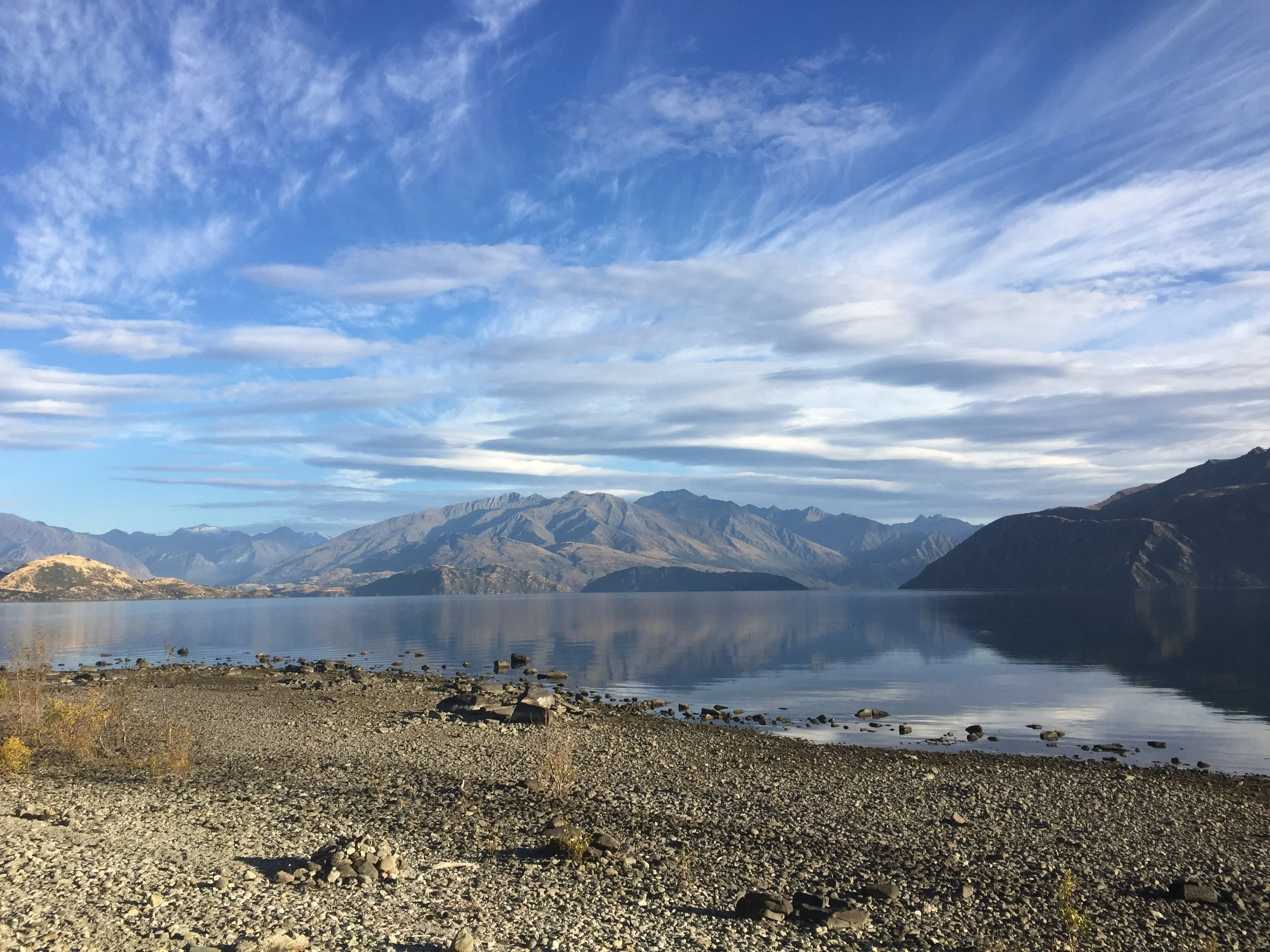 Eventually the sun rose and it got slightly warmer, although not warm enough to delayer, but at last I could see where I was going. The walk was really pleasant, a nice stroll along the river which turned into walking alongside Lake Wanaka. Half way I caught up to Sandy and Colin and we walked the last part together. We headed straight for the New World and bought food to eat now which we took to the park to eat and make a plan for the next section. I did say to them if they want me to bugger off and leave them to finish up their hike on their own then I would, but they seem happy to have me around and we may see this thing through to the end together.