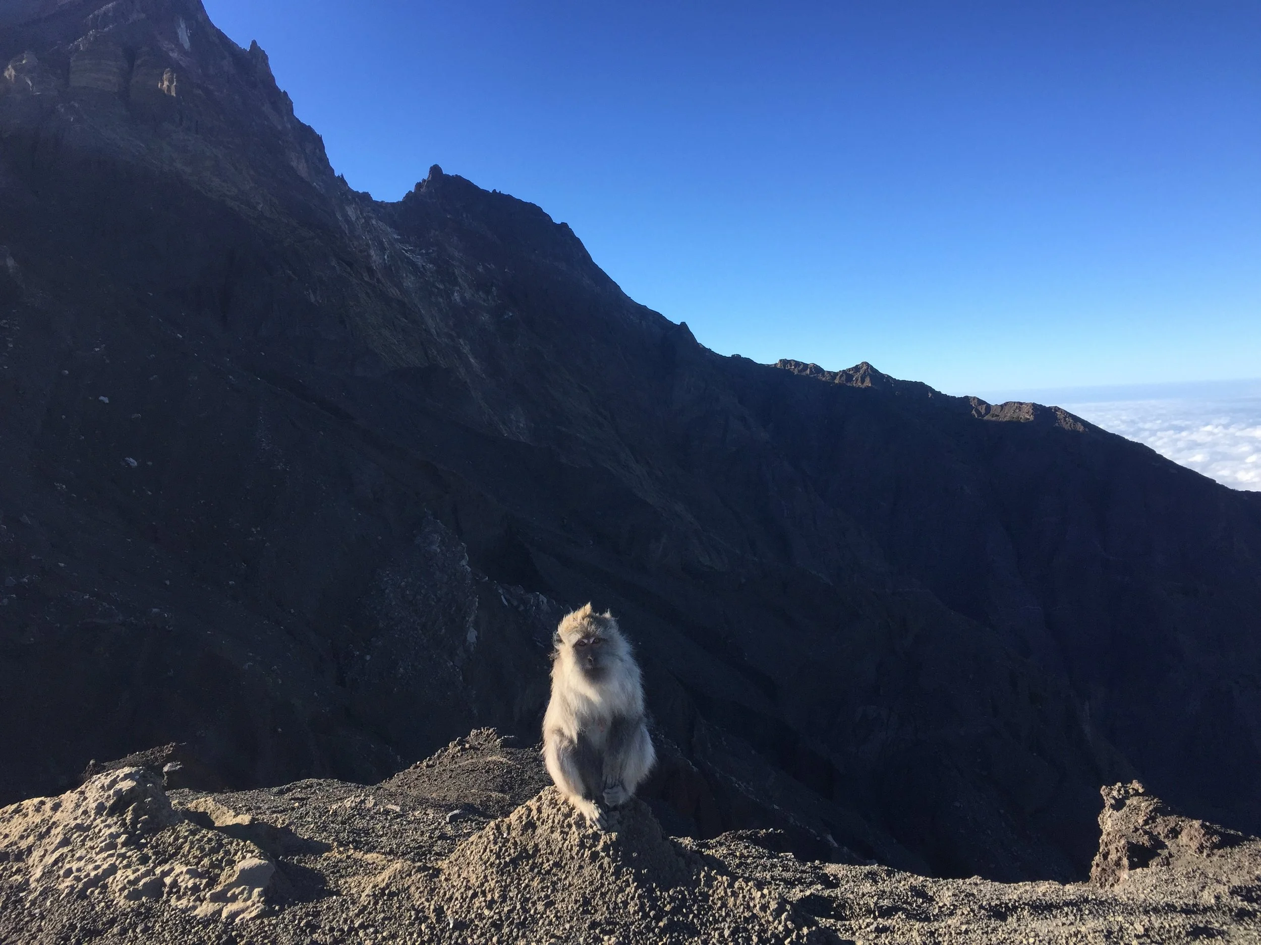 On the way back down we saw lots of people still coming up, a lot of them were being dragged up by guides or porters. For a lot of people this is the first time they have climbed up anything and it must be a bit of a shock for them. The way down was pretty treacherous, I mostly slid down with half of the volcano in my shoes. They became really heavy and very tight so they had to be emptied a few times. It was so tiring, the relentless struggle to try and sty upright. There were a whole bunch of monkeys hanging around, scavenging dropped banana skins. Everyone was in front of Laurie and I, except one of the French guys, and our two porters seemed to stick with us, both behind us. One of them really should have been guiding.